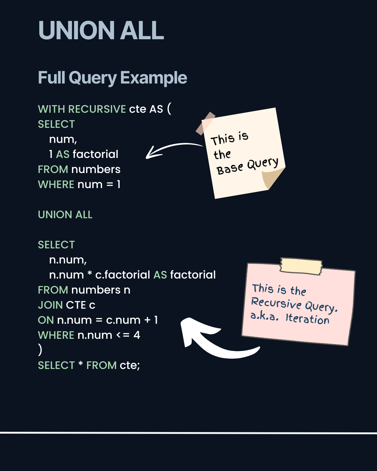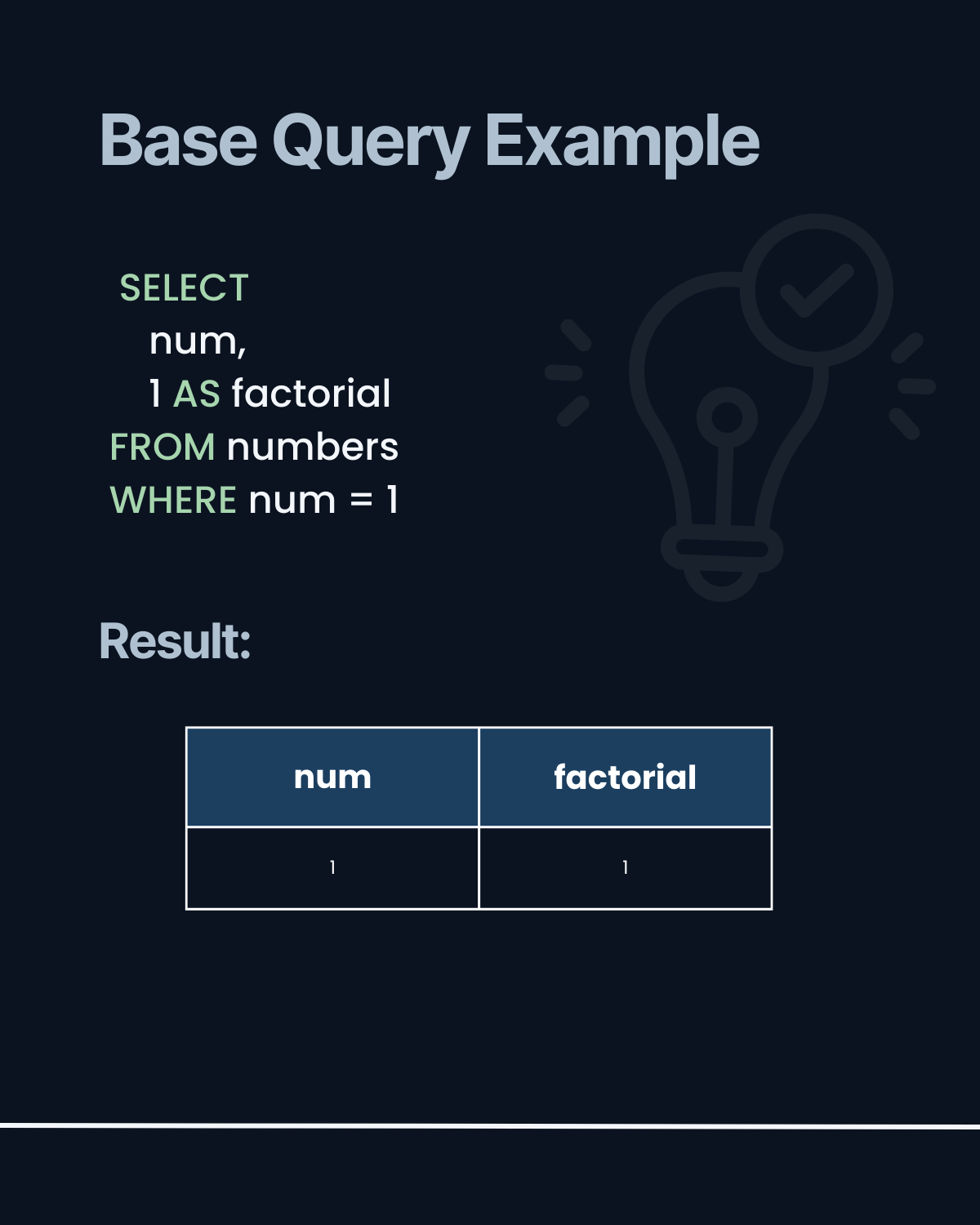Our base query gives us a base table with num 1 and factorial 1. Our recursion then goes through, adds 1 to num making it 2. And then multiplies the new num by the last factorial. 2 * 1, also giving us 2.