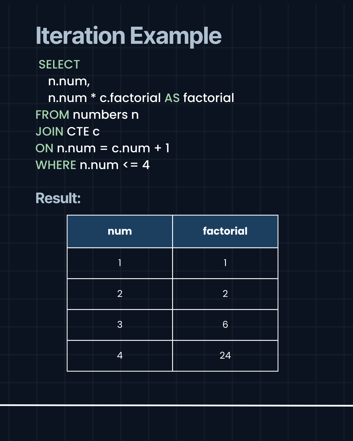WHERE clause (WHERE n.num <= 4)Resulting in a final table of 1 - 4 with their factorials.